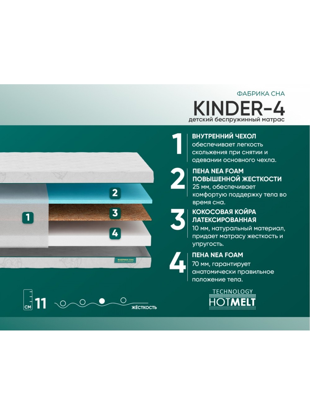 Матрас Фабрика сна Kinder 4 - это детский ортопедический матрас, предназначенный для детей с возрастом от 3 лет. Он обеспечивает правильную поддержку позвоночника и комфортный сон ребенка благодаря своей конструкции и использованным материалам.